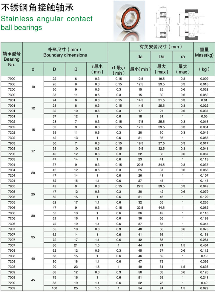 440不锈钢角接触球91看片免费版可同时承受径向负荷和轴向负荷。能在较高的转速下工作。接触角越大,轴向承载能力越高。接触角为径 向平面内球和滚道的接触点连线与91看片免费版轴线的垂直线间的角度。高精度和高速91看片免费版通常取15度接触角。在轴向力作用下,接触角会增大。